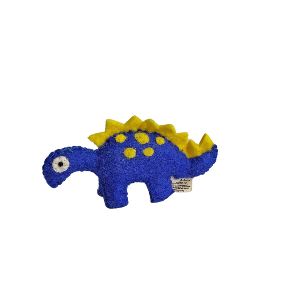 This small dinosaur measures about 18 cm long by 9 cm tall. It has embroidered eyes and has been toy safety tested.