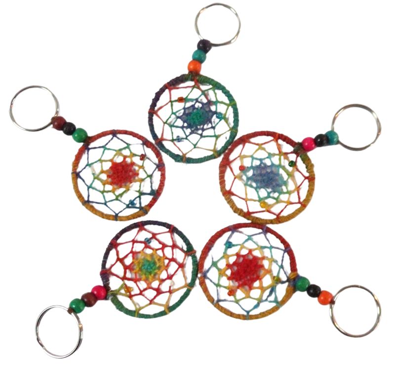 A pretty little keyring/bag charm made from various colours of cotton thread and beads on a metal ring. It is about 5 cms in diameter.