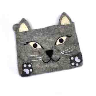 A useful pale grey purse featuring a cheeky cat’s face.