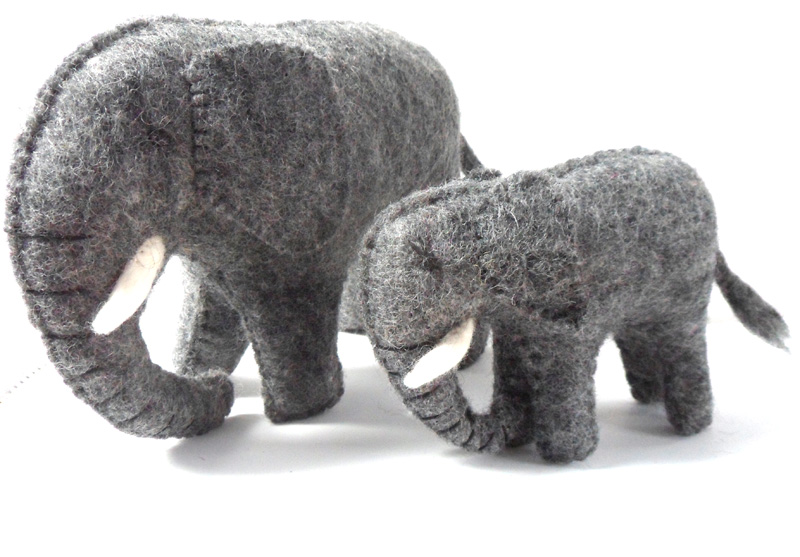 Grey elephant in two sizes. Hand made from 100% wool felt in Nepal under fair trade conditions.