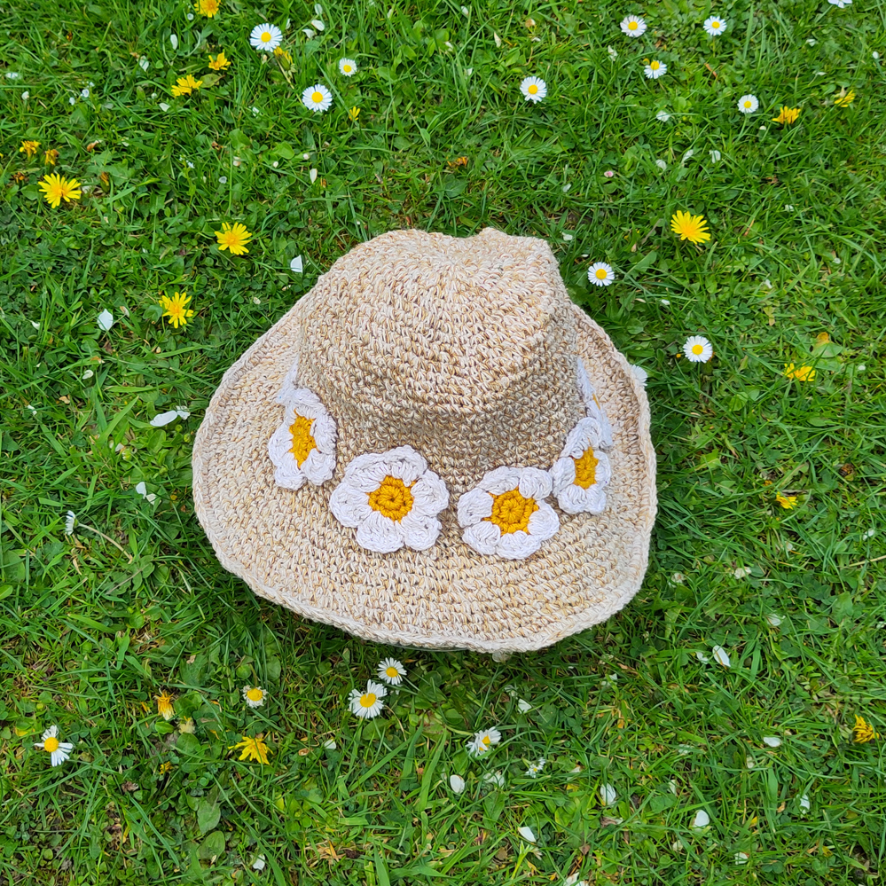 Crocheted hemp and cotton mix hat in natural with a circle of crocheted daisies.