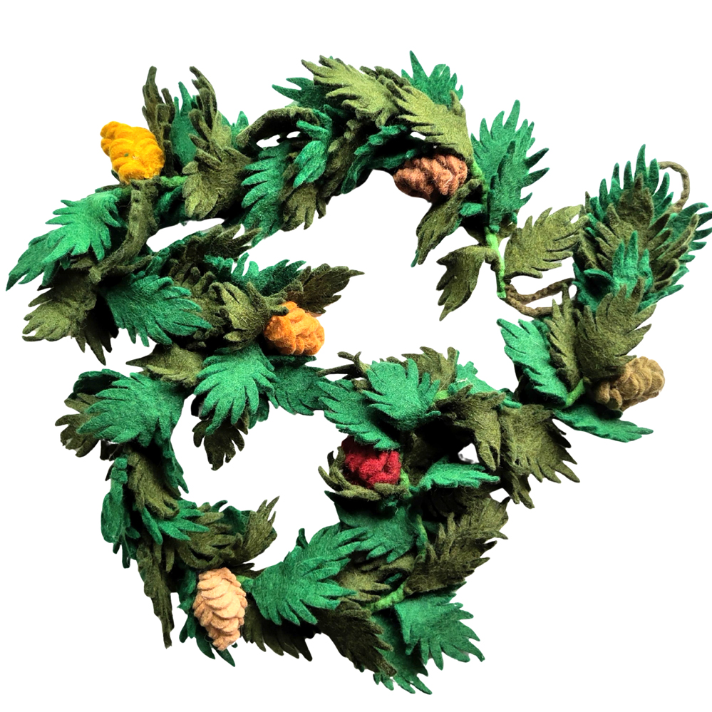 A very attractive garland featuring a string of evergreen leaves with six pine cones.